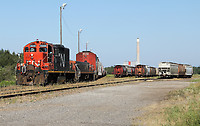 A variety of power moves some cars around the yard in Thunder Bay during a brief break in the clouds.