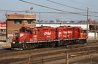 A pair of 50+ years old geeps pass by Rugby Tower at the west end of the CP yard. The units really show thier age and are running on borrowed time.