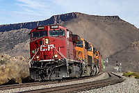 A Canadian Pacific AC4400 leads the nearly daily Belen, NM to Barstow, CA manifest train across the Seligman Sub as it knocks the control point of West Valentine on a windy January afternoon.