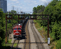Rebuild CP 8006 leads ethanol train CP 650 under a signal bridge on CP's Adirondack Sub.