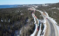 Montreal to Vancouver stacks cross the frozen Little Pic River at Neys