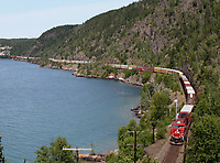A messed up 114 heads through Cavers along the shoreline of Superior. Normally this train has just a few platforms of domestic with the rest marine from Deltaport. That's not the case today!