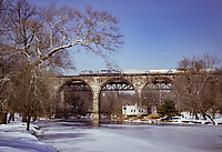 A CSX local from Philadelphia to Wilsmere Yard in Wilmington crosses the frozen Brandywine River. The metal work seen through the arches is for the adjacent highway bridge.