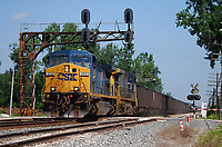 An eastbound train of empties passes under one of the more impressive C&O cantilever signals on the Columbus Sub, known to crews as "Onion." This set of signals along with the cantilever at C-Cabi... (more)