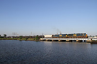 Two CSX GEVOs 5266 and 5475 head south with its train across the Overpeck Creek.