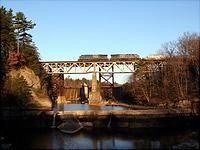 A normally nocturnal train over the Boston Line makes a rare daylight appearance. Q140 with two GEVOs hustle across the Westfield River in Chester descending the grade out of the Berkshire Hills.