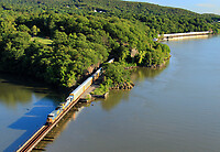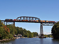 A westbound autorack is next to break the silence of the Ohio and Erie Canal reservation, as Marcy Trestle rumbles with the weight of 89-foot autoracks.