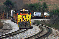 Working through the upper curves of the horseshoe at Mance, Pennsylvania, a westbound CSX intermodal train is climbing Sand Patch Grade to the summit of the Alleghenies. The locomotive consist is ... (more)