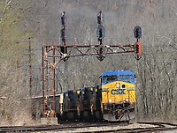 CSX V772, an empty grain train, passes under the C&O styled cantilever signal on the east side of Prince