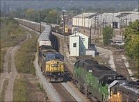 A rolling meet occurs as 216 passes 640 just east of the old P&LE yard office. 216's lead engine #7650 was the class unit for CSX's C40-8Ws. Also visible is local D749, patiently waiting for six... (more)