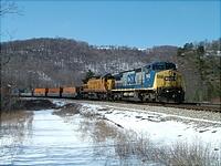 Following in single file, ethanol tanker cars blast north behind two CSX units. The leading Dash 8 built in 1991, CSXT #7662 now executes its duties in "Dark Future" paint rather than i... (more)