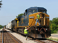 The brakemen of A746 climb back aboard their train after a meet with Q145, but will have to wait nearly an hour for a pair of light engines to come from behind and pass them here at Opelika. Afte... (more)