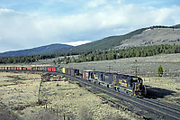 The heavy work now over, an eastbound freight runs downgrade on the eastern slopes of Tennessee Pass at Keeldar, near Leadville, behind 3092, 5317 and 3088, in May 1981.
