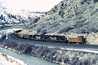 With a little help from the mighty SP, Rio Grande train #146 climbs east through Spanish Fork Canyon on a clear October morning in 1986.
