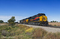 A pair of Iowa Interstate GEVO's lead the eastbound CBBI as it cruises through Brooklyn, Iowa and passes by the Brooklyn Elevator complex along the south side of the small town.