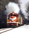 L&O Engineer G.W. Brandenburg is reflected in the front glass as his train departs Versailles, Eastbound.