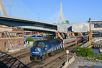 MBTA rolls out of North Station over the Charles River. The tower on the left is an old B&M structure that is still used to control the lift bridges. For some reason, this F40 wears a DOT livery a... (more)