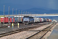 The crew for the afternoon's westbound Laurel to Missoula manifest heads down the lead to their awaiting train just minutes after a pre-summer thunderstorm soaked the area.