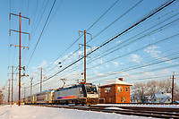 An NJT ALP-46 leads a set of bi-level coaches into Pennsylvania on a dead head move to the commuter agency's Morrisville yard. "Morris" tower, seen in the center was built by the PRR in... (more)