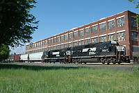 Northbound with a long train passing former champ Hat factory in morning sun.