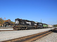 Train A64 rounds the curve at Henry Ellen with a wiley old Southern Railway work horse in charge.