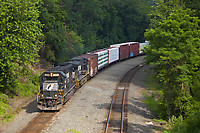 After squiggling down the creek from Bluefield this auto rack train is cruising along the New River.
