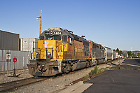 Union Pacific makes its once-a-week (if needed) run up the old Pacific Electric San Bernardino Line remnant between San Bernardino and Rialto, California. The ROW undulates a bit.