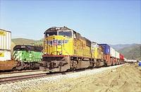UP Westbound Intermodal Train meets an eastbound BNSF intermodal train at Caliente, Ca.