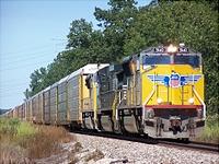 A clean UP SD70M 5140, an NS Dash 9 and another UP SD70M slowly lead a Westbound Autorack through Coal City.