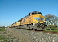 Still looking brand new, UP 5454 leads a southbound manifest out of the Sunset Whitney siding, only about 5 miles north of Roseville. UP 5454 was the first new UP GE delivered with the yellow fra... (more)