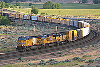A quartet of Union Pacific leads a stacktrain west on trackage rights on BNSF's Cajon Subdivision at Frost.
