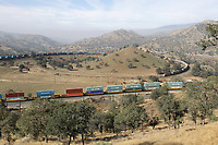With a GE on each end, a stack train climbs through the upper Feather River Canyon near Cromberg.