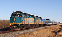 VIA 600 is leaving Rivière-à -Pierre after making its stop at the station, seen in the distance. This train originated in Jonquière in northern Quebec and is bound for Montreal. At Hervey Jct it... (more)