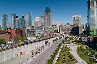 VIA 919 is pushing the consist of VIA 63 past the Peel Basin and Griffintown's condo towers into Montreal's Central Station.