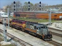 A Canadian National exAlstom SD40-3 sublettered WC and a WC SD45 lead a train south on the CSX Monon Sub.