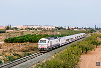 Talgo 00463 Barcelona-Lorca with the last 252 in blue livery passing near Cubelles beach.