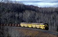 Loaded taconite train with LTV's "6-Pack" of F9s rolls toward Taconite Harbor.