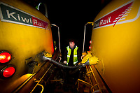 Loco Engineer Neil D. connects the MU cable and brake hoses between three banker locos and the road power of an eastbound coal train for a run up through the 3% Otira tunnel. 5304 is the lead lead... (more)