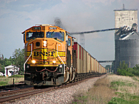Rounding the corner right into the low, bright sun. Empty Unit Coal - Twin Cities, MN - North Antelope Mine, WY.