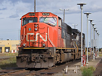 In the last light of the evening, CN 2652 solo crests the grade at the east switch Annex with a lengthy manifest of grain empties, chemicals & forest products in tow.