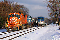 Passing the clock in downtown, EJ&E 675 and GTW 4909 make for a great lash-up on this code blue day in Lemont.