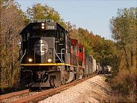 IC 1019 and a CN C44-9W leads M320 through the beautiful fall foilage at North Valley on its way to CN Jackson Yard.