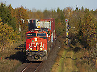 Another quality intermodal train, led by a CN thunder cab, makes the charge north through Duplainville.