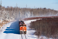In the bitter cold, southbound ore loads out of Fairlane let off a cloud of steam as the EMD set heads for the Kelsey siding to meet two northbounds.