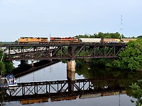 UP 9677 casts its reflection into the Wisconsin River as it leads CP 380 east through the Dells.