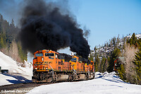 After meeting a westbound at the Winter Park siding, the SD70ACe's of this eastbound manifest billow smoke as it struggles to restart on the grade.
