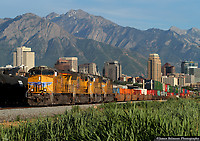 An EMD/GE combo leads Union Pacific's Long Beach, CA to Global 2, IL stack train east through UP North Yard in Salt Lake City.
