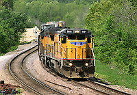 UP's Clinton to Peoria manifest descends the 1% grade of Radnor Hill behind a C40-8 with the "moustashe" version of the wings.