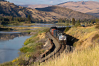 MRL's "Night Gas" local (Missoula to Thompson Falls, MT turn) cruises west along the Clark Fork River just west of Perma, MT.
