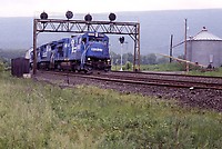 A westbound mail train is attacking the mountain on a May afternoon. Power is typical of the era - a trio of four axle GE and EMD power, although newer units were soon to take over. The scene is b... (more)